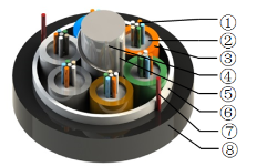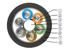 1 光纖、 2 纖膏、 3 松套管、 4 FRP、 5 阻水紗、 6 阻水帶、