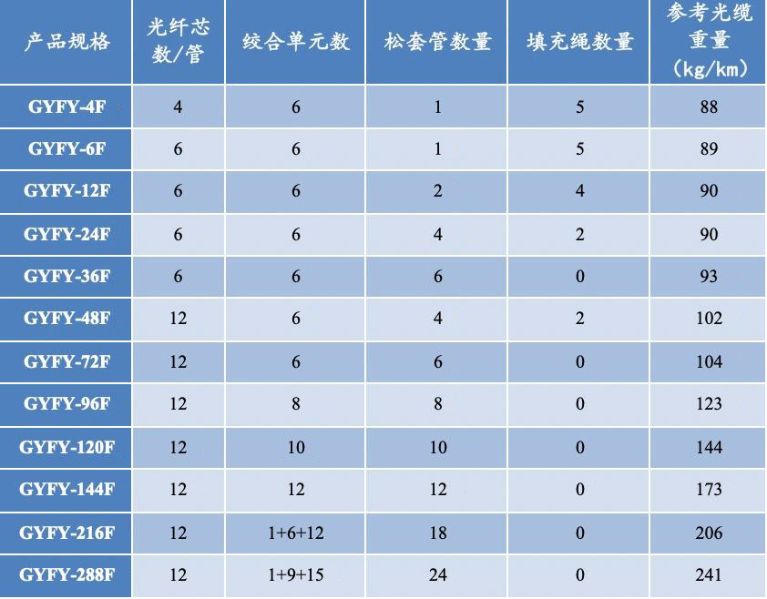 注:1.表中參數(shù)為GYFY典型結(jié)構(gòu)參數(shù),我司可提供2~288芯任意規(guī)格或特殊結(jié)構(gòu)參數(shù)的GYFY光纜。