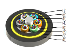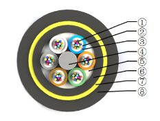 1 光纖、 2 纖膏、 3 松套管、 4 FRP 、 5 阻水纜膏、 6 PE內(nèi)護(hù)套、