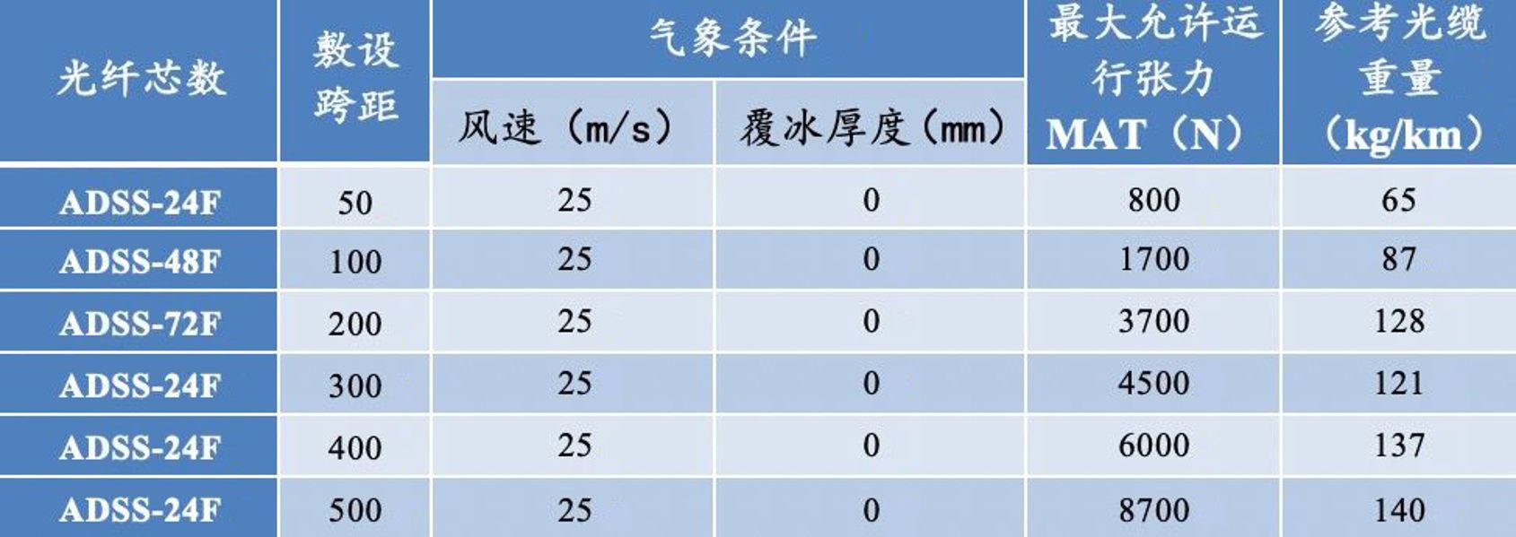 注:1. 表中參數(shù)為ADSS典型結(jié)構(gòu)參數(shù),我司可提供2~144芯任意規(guī)格或特殊結(jié)構(gòu)參數(shù)的ADSS光纜。