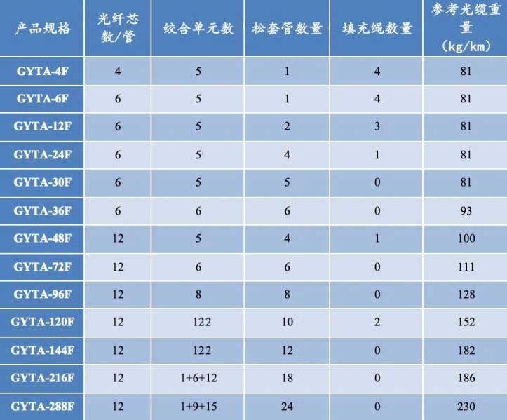 注:1.表中參數(shù)為GYFTY典型結(jié)構(gòu)參數(shù),我司可提供2~288芯任意規(guī)格或特殊結(jié)構(gòu)參數(shù)的GYFTY光纜。