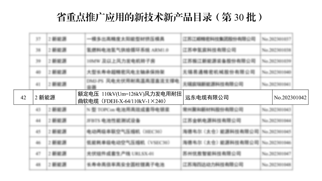 遠東《額定電壓110kV(Um=126kV)風(fēng)力發(fā)電用耐扭曲軟電纜(FDEH-X-64/110kV-1×240)》項目成功入選“江蘇省第30批推廣應(yīng)用新產(chǎn)品新技術(shù)”。