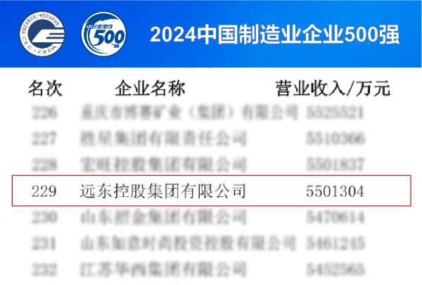 9月20日,以“智造世界?創(chuàng)造美好”為主題的“2024世界制造業(yè)大會(huì)”在合肥舉辦。會(huì)上,中國(guó)企業(yè)聯(lián)合會(huì)、中國(guó)企業(yè)家協(xié)會(huì)發(fā)布了2024中國(guó)制造業(yè)企業(yè)500強(qiáng)榜單,遠(yuǎn)東控股與中國(guó)石化、華為、比亞迪等企業(yè)再次上榜,位列榜單第229位,較上年前進(jìn)10位。