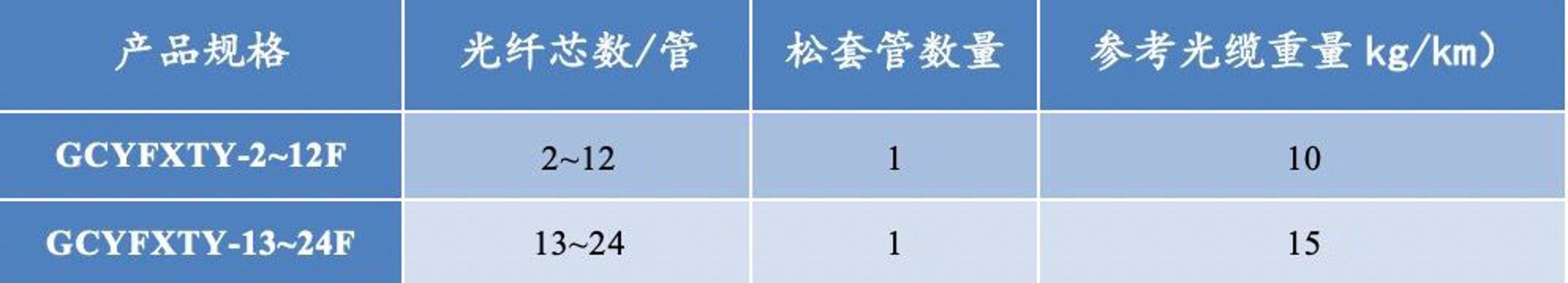 注:1.表中參數(shù)為GCYFXTY典型結(jié)構(gòu)參數(shù),我司可提供2~24芯任意規(guī)格或特殊結(jié)構(gòu)參數(shù)的GCYFXTY光纜。